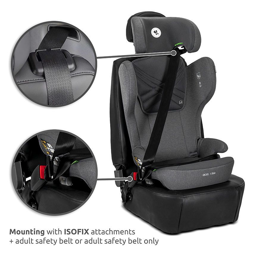 - Συναρμολόγηση με την βοήθεια ISOFIX βυσμάτων + προστατευτικής ζώνης του αυτοκινήτου ή μόνο με προστατευτική ζώνη του αυτοκινήτου